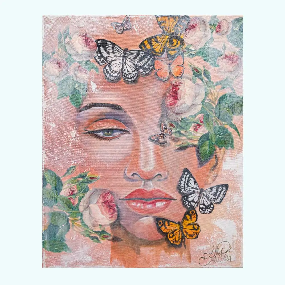 Butterflies are symbolic of rebirth and roses are a symbol of love. The restless and wistful feeling of being in love beckons the spirit to abandon oneself to this beautiful emotion. Then you notice that love has always been there, all around you. It’s in everything you see and touch. It’s in nature and in people’s kindness. Love is a state of being, that begins with ourselves.